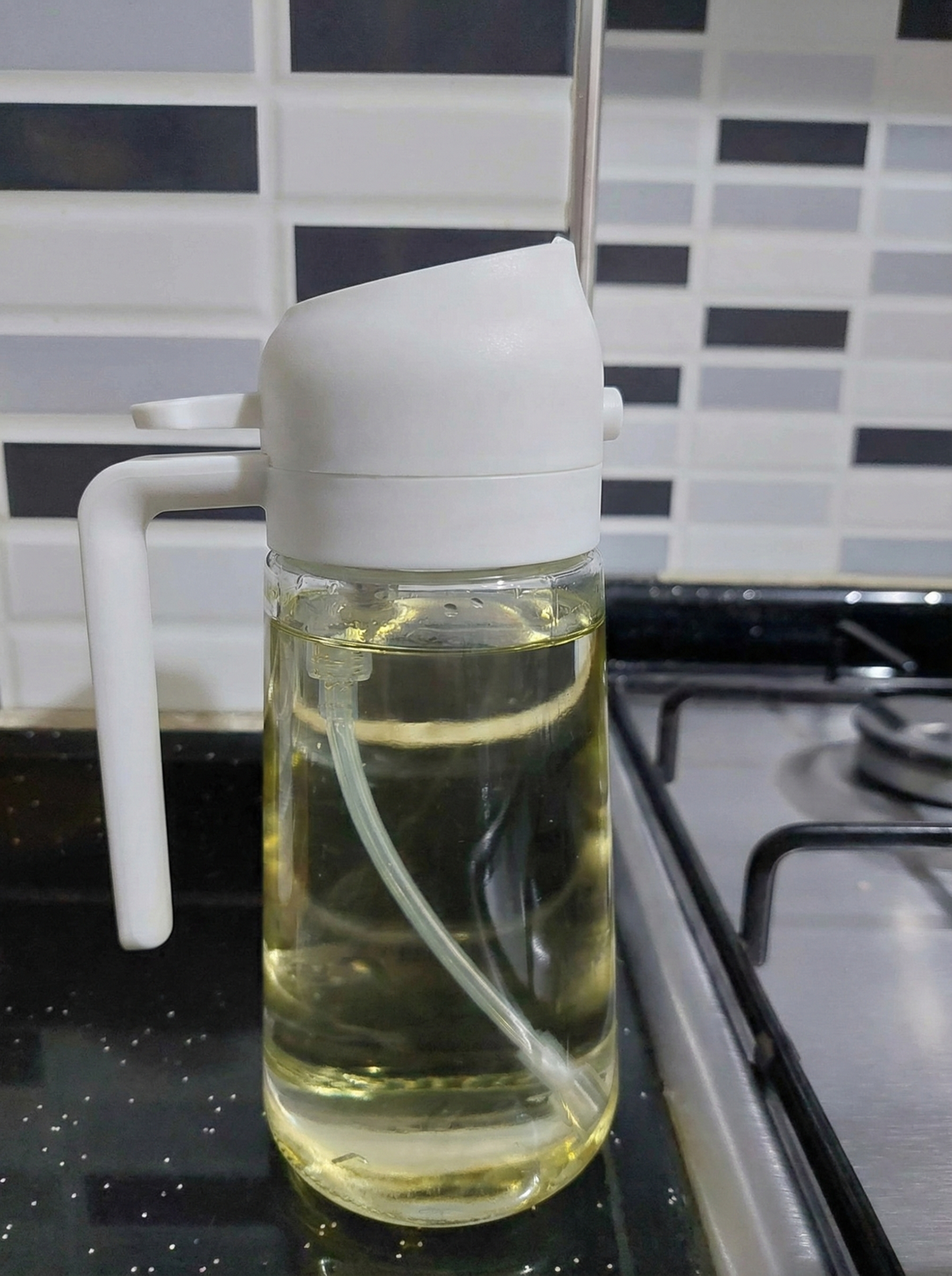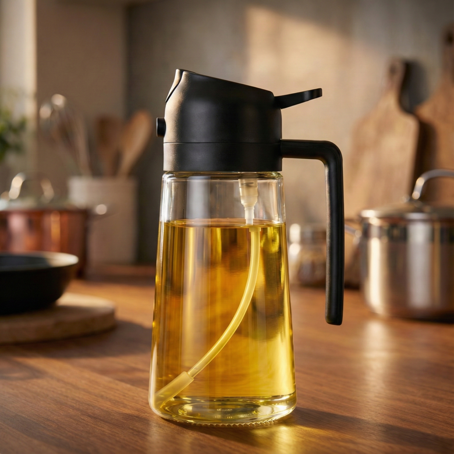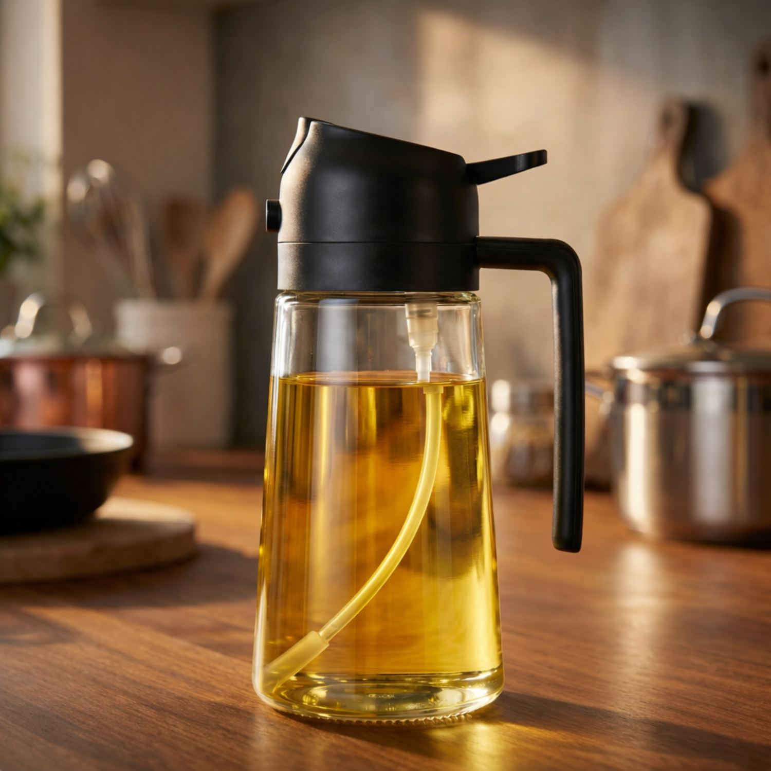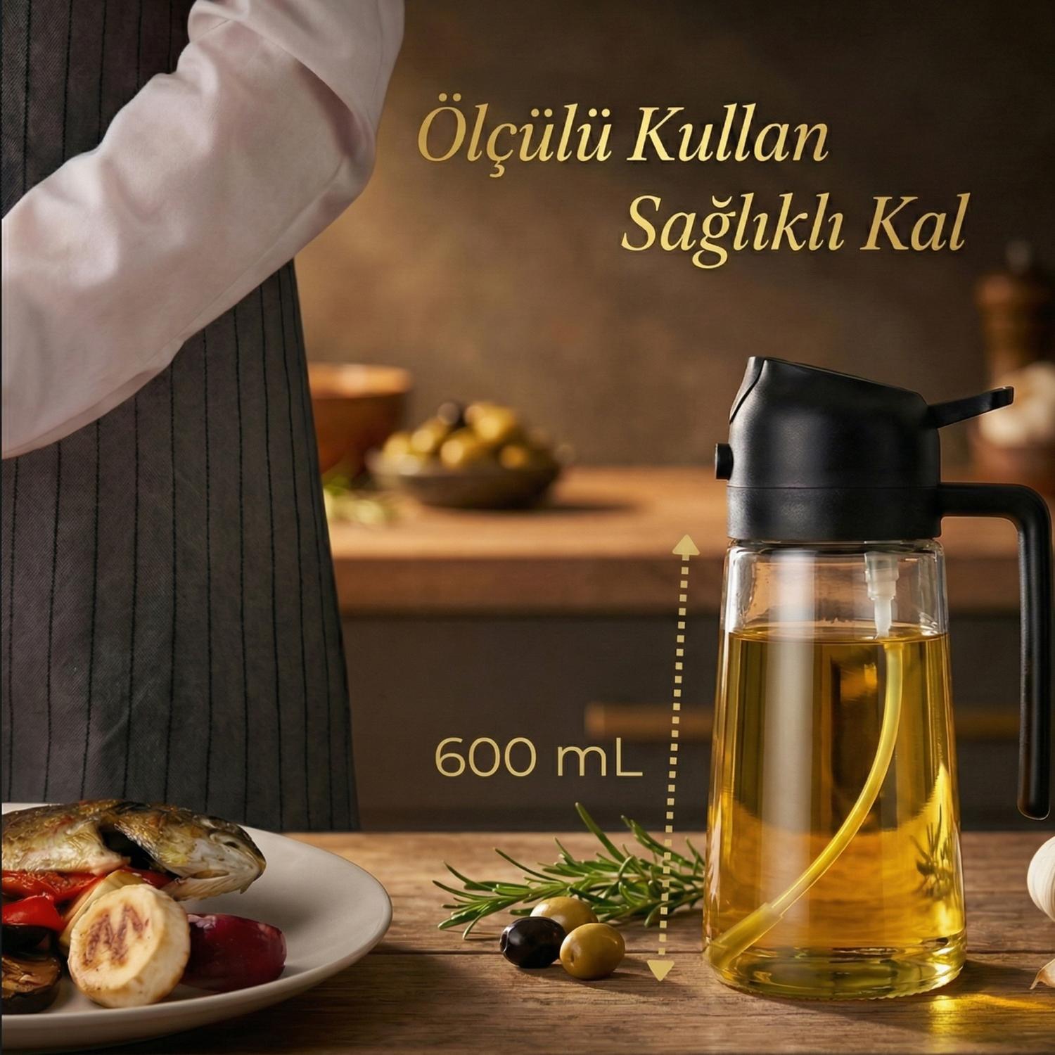 Özel çift fonksiyonlu cam şişe ile yağı kontrol altına alın. Dökme ve püskürtme özellikleri sayesinde ihtiyacınız kadar kullanın, fazlasını tüketmeyin.